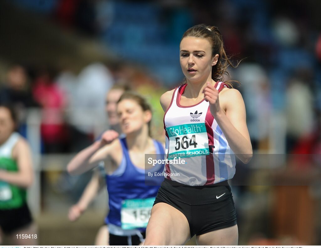 21 May 2016; Sharlene Mawdsley, St Mary's Newport, competing in the Girls Senior 100 Meter final. GloHealth Munster Schools Track & Field Championships, Waterford Regional Sports Centre, Waterford. Photo by Eóin Noonan/Sportsfile