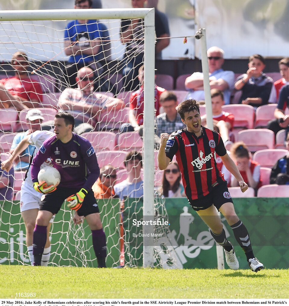 29 May 2016; Jake Kelly of Bohemians celebrates after scoring his side's fourth goal in the SSE Airtricity League Premier Division match between Bohemians and St Patrick's Athletic at Dalymount Park, Dublin. Photo by David Maher/Sportsfile