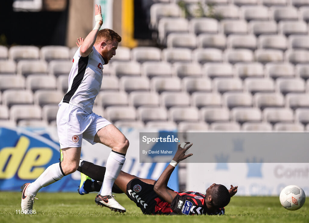 29 May 2016; Sean Hoare of St Patrick's Athletic tackles Ismahil Akinade of Bohemians resulting in a penalty kick being awarded and the player being sent off during the SSE Airtricity League Premier Division match between Bohemians and St Patrick's Athletic at Dalymount Park, Dublin. Photo by David Maher/Sportsfile