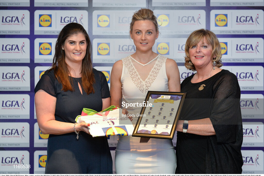 1 June 2016; Sinead McTiernan, Sligo, centre, receives her Division 2 Lidl Ladies Team of the League Award from Aoife Clarke, head of communications, Lidl Ireland, left, and Marie Hickey, President of Ladies Gaelic Football, right, at the Lidl Ladies Teams of the League Award Night. The Lidl Teams of the League were presented at Croke Park with 60 players recognised for their performances throughout the 2016 Lidl National Football League Campaign. The 4 teams were selected by opposition managers who selected the best players in their position with the players receiving the most votes being selected in their position. Croke Park, Dublin. Photo by Cody Glenn/Sportsfile
