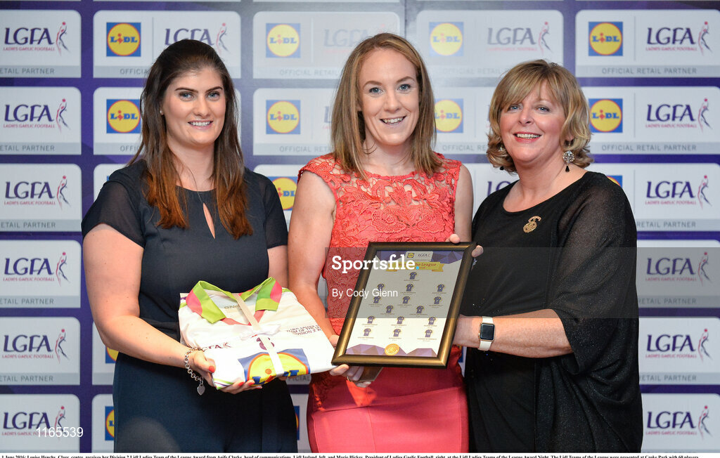 1 June 2016; Louise Henchy, Clare, centre, receives her Division 2 Lidl Ladies Team of the League Award from Aoife Clarke, head of communications, Lidl Ireland, left, and Marie Hickey, President of Ladies Gaelic Football, right, at the Lidl Ladies Teams of the League Award Night. The Lidl Teams of the League were presented at Croke Park with 60 players recognised for their performances throughout the 2016 Lidl National Football League Campaign. The 4 teams were selected by opposition managers who selected the best players in their position with the players receiving the most votes being selected in their position. Croke Park, Dublin. Photo by Cody Glenn/Sportsfile