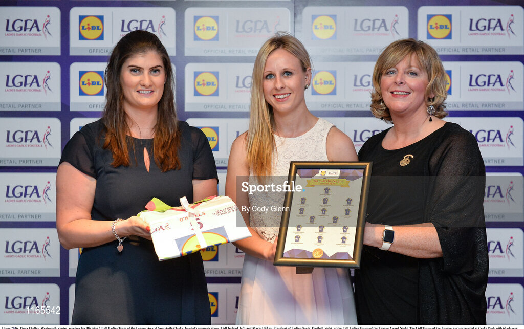 1 June 2016; Fiona Claffey, Westmeath, centre, receives her Division 2 Lidl Ladies Team of the League Award from Aoife Clarke, head of communications, Lidl Ireland, left, and Marie Hickey, President of Ladies Gaelic Football, right, at the Lidl Ladies Teams of the League Award Night. The Lidl Teams of the League were presented at Croke Park with 60 players recognised for their performances throughout the 2016 Lidl National Football League Campaign. The 4 teams were selected by opposition managers who selected the best players in their position with the players receiving the most votes being selected in their position. Croke Park, Dublin. Photo by Cody Glenn/Sportsfile