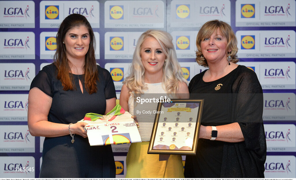 1 June 2016; Tresa Doherty, Donegal, centre, receives her Division 2 Lidl Ladies Team of the League Award from Aoife Clarke, head of communications, Lidl Ireland, left, and Marie Hickey, President of Ladies Gaelic Football, right, at the Lidl Ladies Teams of the League Award Night. The Lidl Teams of the League were presented at Croke Park with 60 players recognised for their performances throughout the 2016 Lidl National Football League Campaign. The 4 teams were selected by opposition managers who selected the best players in their position with the players receiving the most votes being selected in their position. Croke Park, Dublin. Photo by Cody Glenn/Sportsfile