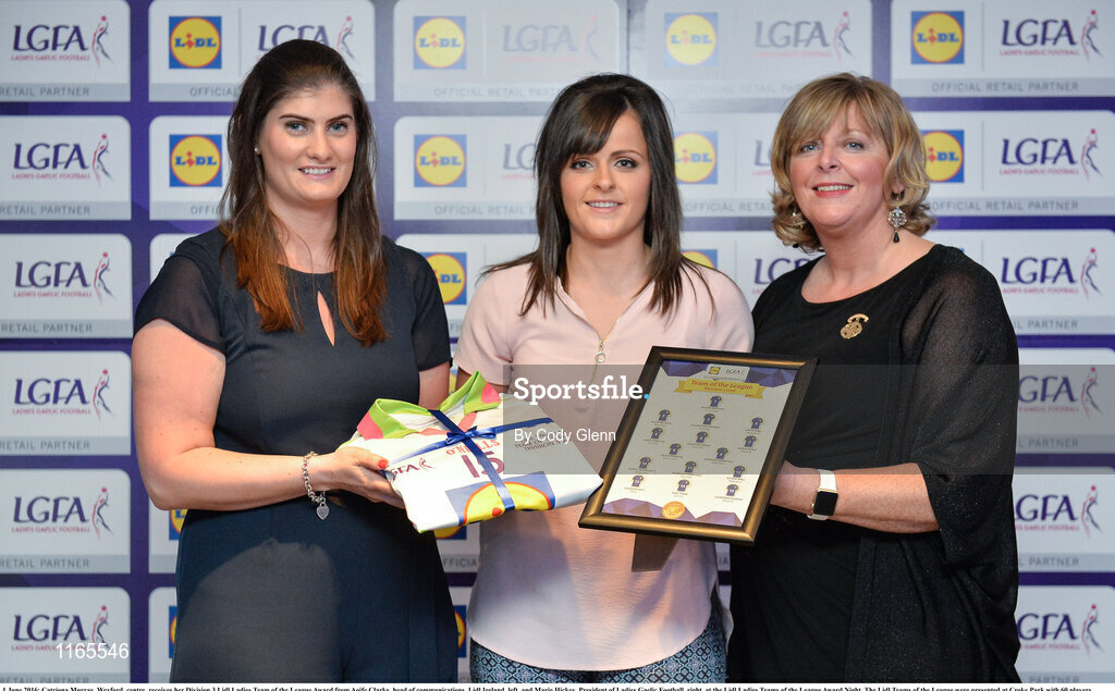 1 June 2016; Catríona Murray, Wexford, centre, receives her Division 3 Lidl Ladies Team of the League Award from Aoife Clarke, head of communications, Lidl Ireland, left, and Marie Hickey, President of Ladies Gaelic Football, right, at the Lidl Ladies Teams of the League Award Night. The Lidl Teams of the League were presented at Croke Park with 60 players recognised for their performances throughout the 2016 Lidl National Football League Campaign. The 4 teams were selected by opposition managers who selected the best players in their position with the players receiving the most votes being selected in their position. Croke Park, Dublin. Photo by Cody Glenn/Sportsfile