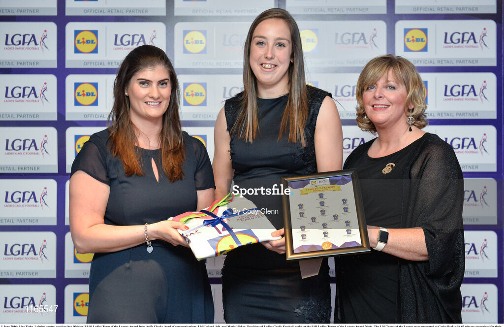 1 June 2016; Áine Tighe, Leitrim, centre, receives her Division 3 Lidl Ladies Team of the League Award from Aoife Clarke, head of communications, Lidl Ireland, left, and Marie Hickey, President of Ladies Gaelic Football, right, at the Lidl Ladies Teams of the League Award Night. The Lidl Teams of the League were presented at Croke Park with 60 players recognised for their performances throughout the 2016 Lidl National Football League Campaign. The 4 teams were selected by opposition managers who selected the best players in their position with the players receiving the most votes being selected in their position. Croke Park, Dublin. Photo by Cody Glenn/Sportsfile
