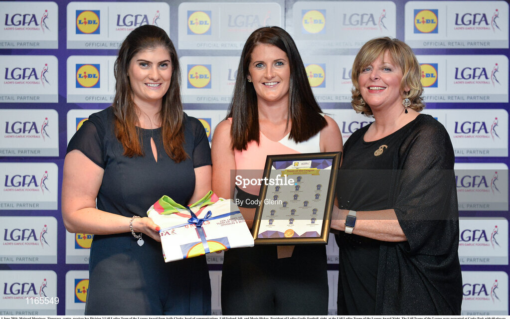 1 June 2016; Mairead Morrissey, Tipperary, centre, receives her Division 3 Lidl Ladies Team of the League Award from Aoife Clarke, head of communications, Lidl Ireland, left, and Marie Hickey, President of Ladies Gaelic Football, right, at the Lidl Ladies Teams of the League Award Night. The Lidl Teams of the League were presented at Croke Park with 60 players recognised for their performances throughout the 2016 Lidl National Football League Campaign. The 4 teams were selected by opposition managers who selected the best players in their position with the players receiving the most votes being selected in their position. Croke Park, Dublin. Photo by Cody Glenn/Sportsfile