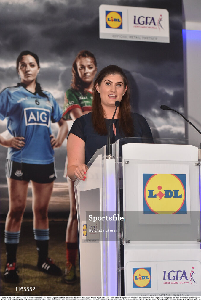 1 June 2016; Aoife Clarke, head of communications, Lidl Ireland, speaks at the Lidl Ladies Teams of the League Award Night. The Lidl Teams of the League were presented at Croke Park with 60 players recognised for their performances throughout the 2016 Lidl National Football League Campaign. The 4 teams were selected by opposition managers who selected the best players in their position with the players receiving the most votes being selected in their position. Croke Park, Dublin. Photo by Cody Glenn/Sportsfile