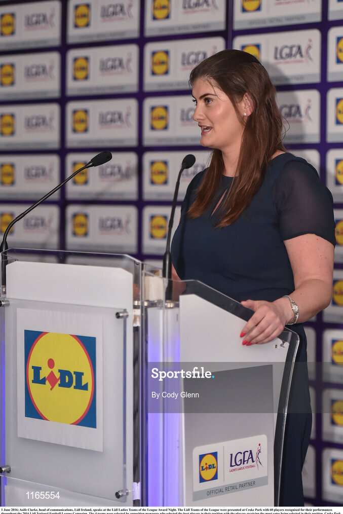 1 June 2016; Aoife Clarke, head of communications, Lidl Ireland, speaks at the Lidl Ladies Teams of the League Award Night. The Lidl Teams of the League were presented at Croke Park with 60 players recognised for their performances throughout the 2016 Lidl National Football League Campaign. The 4 teams were selected by opposition managers who selected the best players in their position with the players receiving the most votes being selected in their position. Croke Park, Dublin. Photo by Cody Glenn/Sportsfile