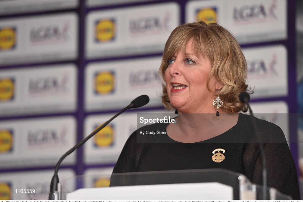 1 June 2016; Marie Hickey, President of Ladies Gaelic Football, speaks at the Lidl Ladies Teams of the League Award Night. The Lidl Teams of the League were presented at Croke Park with 60 players recognised for their performances throughout the 2016 Lidl National Football League Campaign. The 4 teams were selected by opposition managers who selected the best players in their position with the players receiving the most votes being selected in their position. Croke Park, Dublin. Photo by Cody Glenn/Sportsfile