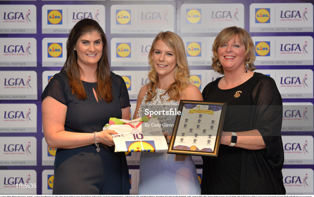 1 June 2016; Mairead Cooper, Antrim, receives her Division 4 Lidl Ladies Team of the League Award from Aoife Clarke, head of communications, Lidl Ireland, left, and Marie Hickey, President of Ladies Gaelic Football, right, at the Lidl Ladies Teams of the League Award Night. The Lidl Teams of the League were presented at Croke Park with 60 players recognised for their performances throughout the 2016 Lidl National Football League Campaign. The 4 teams were selected by opposition managers who selected the best players in their position with the players receiving the most votes being selected in their position. Croke Park, Dublin. Photo by Cody Glenn/Sportsfile