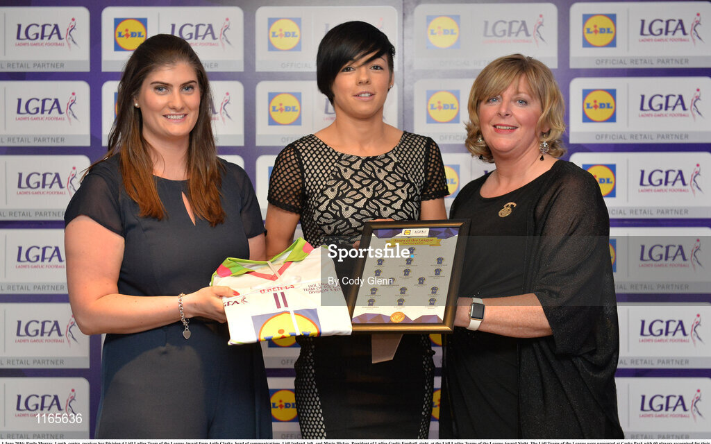 1 June 2016; Paula Murray, Louth, centre, receives her Division 4 Lidl Ladies Team of the League Award from Aoife Clarke, head of communications, Lidl Ireland, left, and Marie Hickey, President of Ladies Gaelic Football, right, at the Lidl Ladies Teams of the League Award Night. The Lidl Teams of the League were presented at Croke Park with 60 players recognised for their performances throughout the 2016 Lidl National Football League Campaign. The 4 teams were selected by opposition managers who selected the best players in their position with the players receiving the most votes being selected in their position. Croke Park, Dublin. Photo by Cody Glenn/Sportsfile