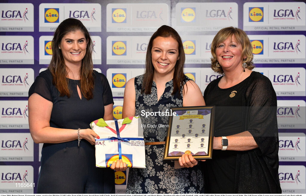 1 June 2016; Roisín Gleeson, Fermanagh, centre, receives her Division 3 Lidl Ladies Team of the League Award from Aoife Clarke, head of communications, Lidl Ireland, left, and Marie Hickey, President of Ladies Gaelic Football, right, at the Lidl Ladies Teams of the League Award Night. The Lidl Teams of the League were presented at Croke Park with 60 players recognised for their performances throughout the 2016 Lidl National Football League Campaign. The 4 teams were selected by opposition managers who selected the best players in their position with the players receiving the most votes being selected in their position. Croke Park, Dublin. Photo by Cody Glenn/Sportsfile