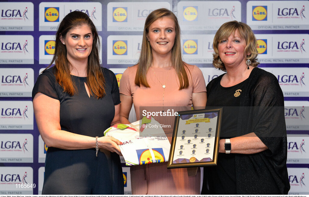 1 June 2016; Anna McCann, Antrim, centre, receives her Division 4 Lidl Ladies Team of the League Award from Aoife Clarke, head of communications, Lidl Ireland, left, and Marie Hickey, President of Ladies Gaelic Football, right, at the Lidl Ladies Teams of the League Award Night. The Lidl Teams of the League were presented at Croke Park with 60 players recognised for their performances throughout the 2016 Lidl National Football League Campaign. The 4 teams were selected by opposition managers who selected the best players in their position with the players receiving the most votes being selected in their position. Croke Park, Dublin. Photo by Cody Glenn/Sportsfile