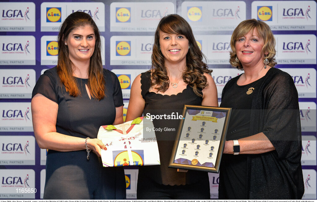 1 June 2016; Alva Neary, Limerick, centre, receives her Division 4 Lidl Ladies Team of the League Award from Aoife Clarke, head of communications, Lidl Ireland, left, and Marie Hickey, President of Ladies Gaelic Football, right, at the Lidl Ladies Teams of the League Award Night. The Lidl Teams of the League were presented at Croke Park with 60 players recognised for their performances throughout the 2016 Lidl National Football League Campaign. The 4 teams were selected by opposition managers who selected the best players in their position with the players receiving the most votes being selected in their position. Croke Park, Dublin. Photo by Cody Glenn/Sportsfile