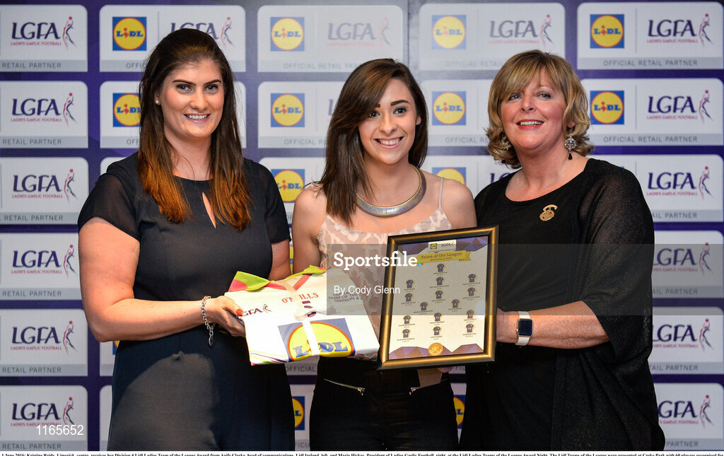 1 June 2016; Kristine Reidy, Limerick, centre, receives her Division 4 Lidl Ladies Team of the League Award from Aoife Clarke, head of communications, Lidl Ireland, left, and Marie Hickey, President of Ladies Gaelic Football, right, at the Lidl Ladies Teams of the League Award Night. The Lidl Teams of the League were presented at Croke Park with 60 players recognised for their performances throughout the 2016 Lidl National Football League Campaign. The 4 teams were selected by opposition managers who selected the best players in their position with the players receiving the most votes being selected in their position. Croke Park, Dublin. Photo by Cody Glenn/Sportsfile