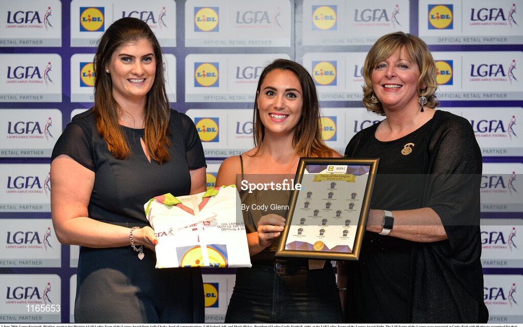 1 June 2016; Lorna Fusciardi, Wicklow, receives her Division 4 Lidl Ladies Team of the League Award from Aoife Clarke, head of communications, Lidl Ireland, left, and Marie Hickey, President of Ladies Gaelic Football, right, at the Lidl Ladies Teams of the League Award Night. The Lidl Teams of the League were presented at Croke Park with 60 players recognised for their performances throughout the 2016 Lidl National Football League Campaign. The 4 teams were selected by opposition managers who selected the best players in their position with the players receiving the most votes being selected in their position. Croke Park, Dublin. Photo by Cody Glenn/Sportsfile