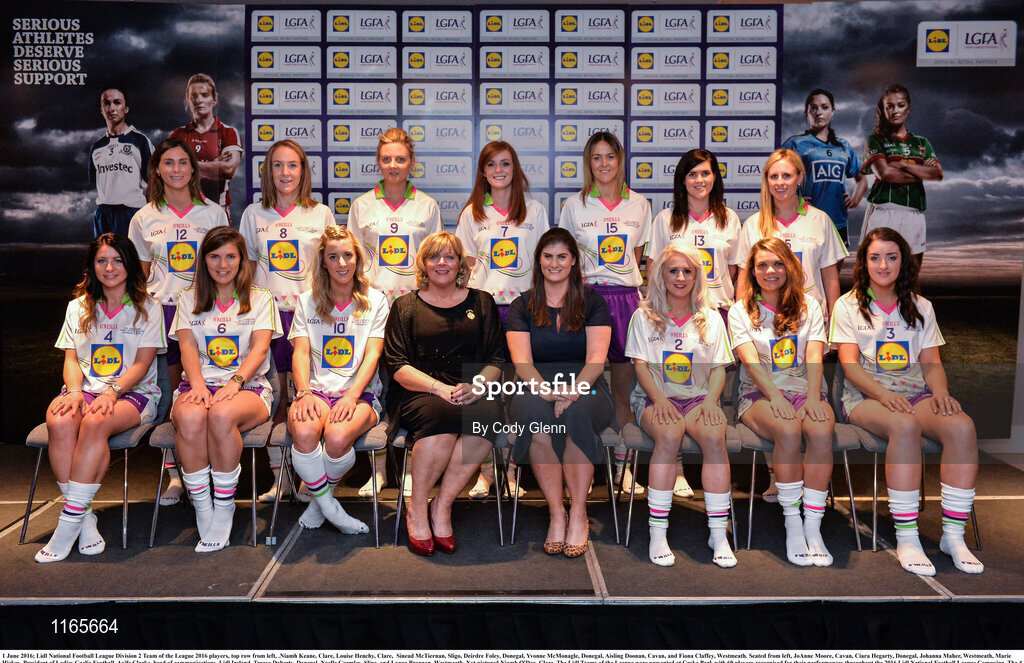 1 June 2016; Lidl National Football League Division 2 Team of the League 2016 players, top row from left, .Niamh Keane, Clare, Louise Henchy, Clare, Sinead McTiernan, Sligo, Deirdre Foley, Donegal, Yvonne McMonagle, Donegal, Aisling Doonan, Cavan, and Fiona Claffey, Westmeath. Seated from left, JoAnne Moore, Cavan, Ciara Hegarty, Donegal, Johanna Maher, Westmeath, Marie Hickey, President of Ladies Gaelic Football, Aoife Clarke, head of communications, Lidl Ireland, Treasa Doherty, Donegal, Noelle Gormley, Sligo, and Laura Brennan, Westmeath. Not pictured Niamh O'Dea, Clare. The Lidl Teams of the League were presented at Croke Park with 60 players recognised for their performances throughout the 2016 Lidl National Football League Campaign. The 4 teams were selected by opposition managers who selected the best players in their position with the players receiving the most votes being selected in their position. Croke Park, Dublin. Photo by Cody Glenn/Sportsfile