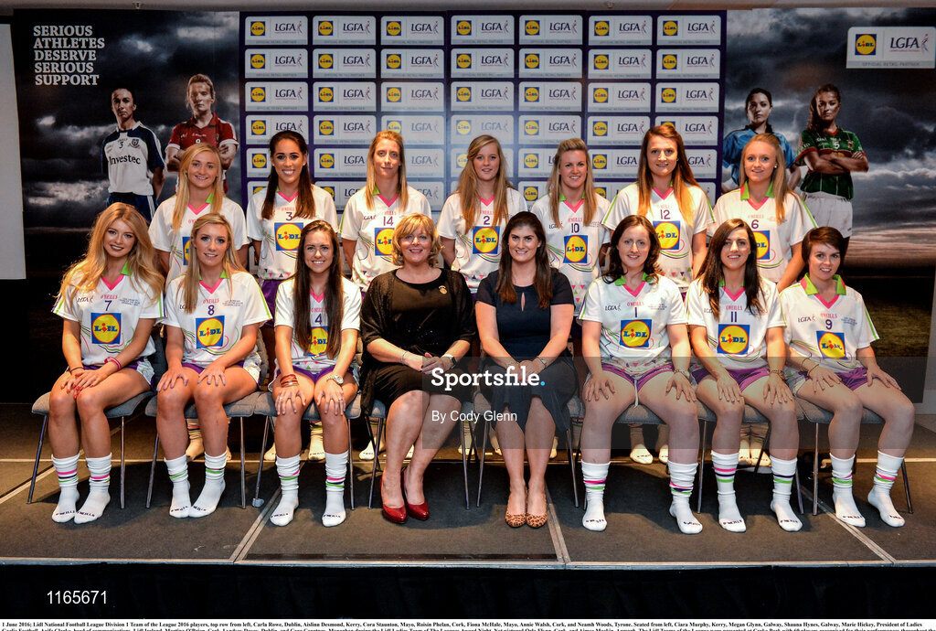 1 June 2016; Lidl National Football League Division 1 Team of the League 2016 players, top row from left, Carla Rowe, Dublin, Aislinn Desmond, Kerry, Cora Staunton, Mayo, Roisín Phelan, Cork, Fiona McHale, Mayo, Annie Walsh, Cork, and Neamh Woods, Tyrone. Seated from left, Ciara Murphy, Kerry, Megan Glynn, Galway, Shauna Hynes, Galway, Marie Hickey, President of Ladies Gaelic Football, Aoife Clarke, head of communications, Lidl Ireland, Martina O'Brien, Cork, Lyndsey Davey, Dublin, and Cora Courtney, Monaghan during the Lidl Ladies Team of The Leagues Award Night. Not pictured Orla Flynn, Cork, and Aimee Mackin, Armagh. The Lidl Teams of the League were presented at Croke Park with 60 players recognised for their performances throughout the 2016 Lidl National Football League Campaign. The 4 teams were selected by opposition managers who selected the best players in their position with the players receiving the most votes being selected in their position. Croke Park, Dublin. Photo by Cody Glenn/Sportsfile