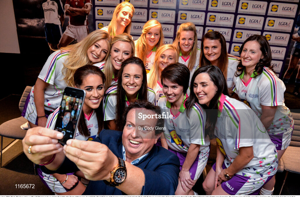 1 June 2016; Marty Morrissey takes a selfie with Division 1 players during the Lidl Ladies Teams of the League Award Night. The Lidl Teams of the League were presented at Croke Park with 60 players recognised for their performances throughout the 2016 Lidl National Football League Campaign. The 4 teams were selected by opposition managers who selected the best players in their position with the players receiving the most votes being selected in their position. Croke Park, Dublin. Photo by Cody Glenn/Sportsfile