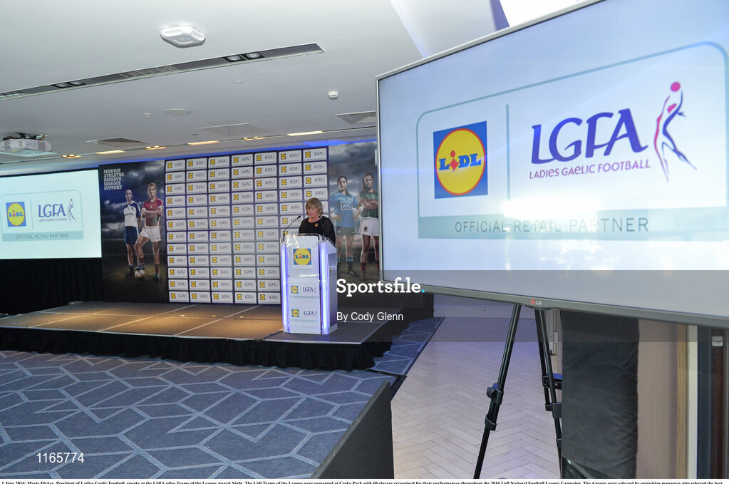 1 June 2016; Marie Hickey, President of Ladies Gaelic Football, speaks at the Lidl Ladies Teams of the League Award Night. The Lidl Teams of the League were presented at Croke Park with 60 players recognised for their performances throughout the 2016 Lidl National Football League Campaign. The 4 teams were selected by opposition managers who selected the best players in their position with the players receiving the most votes being selected in their position. Croke Park, Dublin. Photo by Cody Glenn/Sportsfile