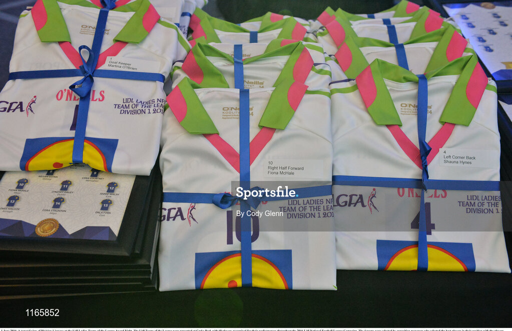 1 June 2016; A general view of Division 1 jerseys at the Lidl Ladies Teams of the League Award Night. The Lidl Teams of the League were presented at Croke Park with 60 players recognised for their performances throughout the 2016 Lidl National Football League Campaign. The 4 teams were selected by opposition managers who selected the best players in their position with the players receiving the most votes being selected in their position. Croke Park, Dublin. Photo by Cody Glenn/Sportsfile