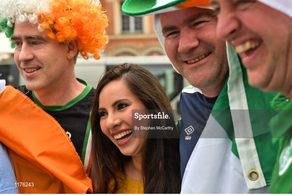 21 June 2016; Republic of Ireland supporters, left to right, Anthon Donnelly, Luke Donnelly and David Donnelly, from Rahara, Co. Roscommon, with a Lille local, second from left, at UEFA Euro 2016 in Lille, France. Photo by Stephen McCarthy/Sportsfile