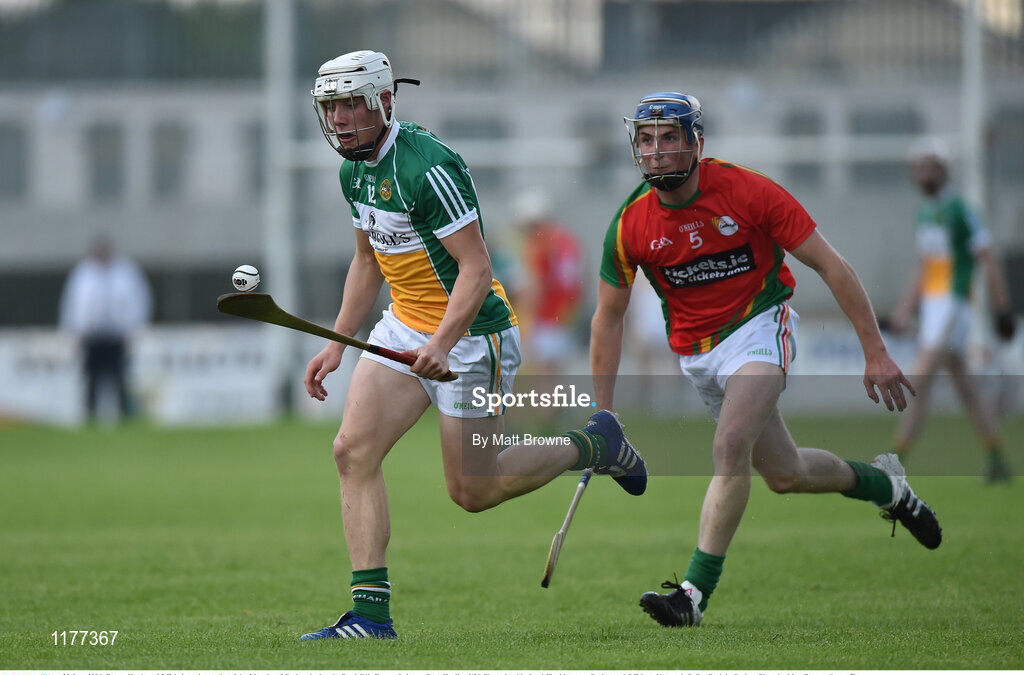 23 June 2016; Ronan Hughes of Offaly in action against John Murphy of Carlow during the Bord Gáis Energy Leinster GAA Hurling U21 Championship Semi-Final between Carlow and Offaly at Netwatch Cullen Park in Carlow. Photo by Matt Browne/Sportsfile
