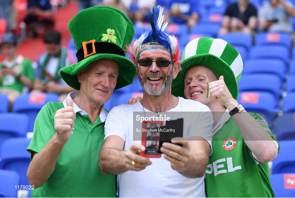 26 June 2016; Republic of Ireland supporters Alan and Jack Keane with a France supporter ahead of the UEFA Euro 2016 Round of 16 match between France and Republic of Ireland at Stade des Lumieres in Lyon, France. Photo by Stephen McCarthy/Sportsfile