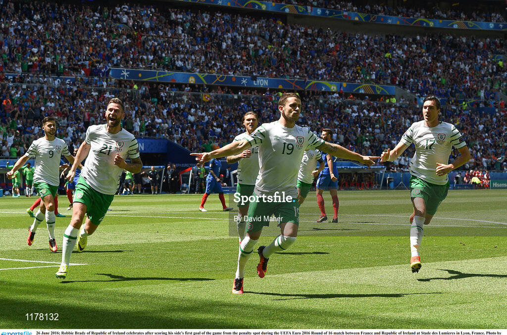 26 June 2016; Robbie Brady of Republic of Ireland celebrates after scoring his side's first goal of the game from the penalty spot during the UEFA Euro 2016 Round of 16 match between France and Republic of Ireland at Stade des Lumieres in Lyon, France. Photo by David Maher/Sportsfile