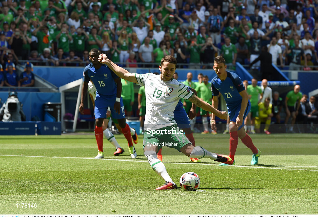 26 June 2016; Robbie Brady of the Republic of Ireland scores the opening goal in the UEFA Euro 2016 Round of 16 match between France and Republic of Ireland at Stade des Lumieres in Lyon, France. Photo by David Maher/Sportsfile