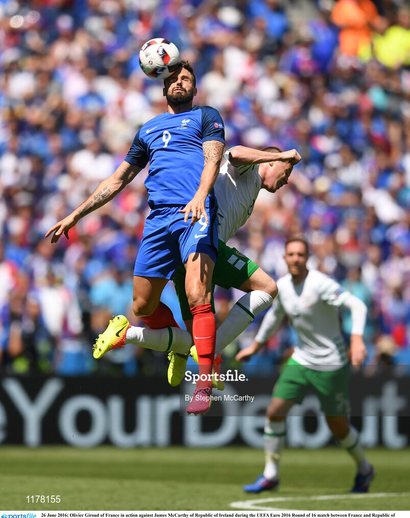 26 June 2016; Olivier Giroud of France in action against James McCarthy of Republic of Ireland during the UEFA Euro 2016 Round of 16 match between France and Republic of Ireland at Stade des Lumieres in Lyon, France. Photo by Stephen McCarthy/Sportsfile