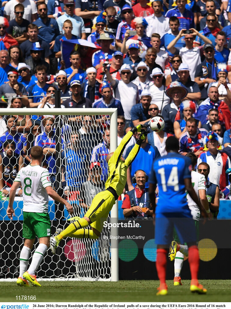 26 June 2016; Darren Randolph of the Republic of Ireland pulls of a save during the UEFA Euro 2016 Round of 16 match between France and Republic of Ireland at Stade des Lumieres in Lyon, France. Photo by Stephen McCarthy/Sportsfile
