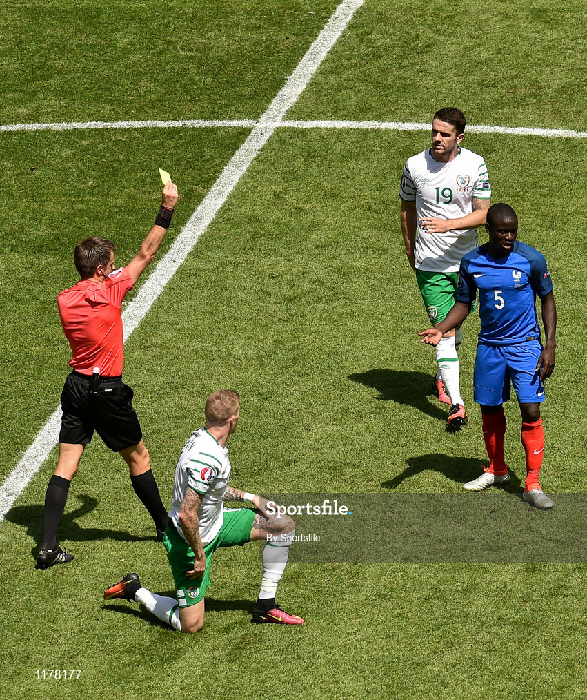 26 June 2016; N'Golo Kanté of France is shown a yellow card by italian referee Nicola Rizzoli in the UEFA Euro 2016 Round of 16 match between France and Republic of Ireland at Stade des Lumieres in Lyon, France. Photo by Sportsfile