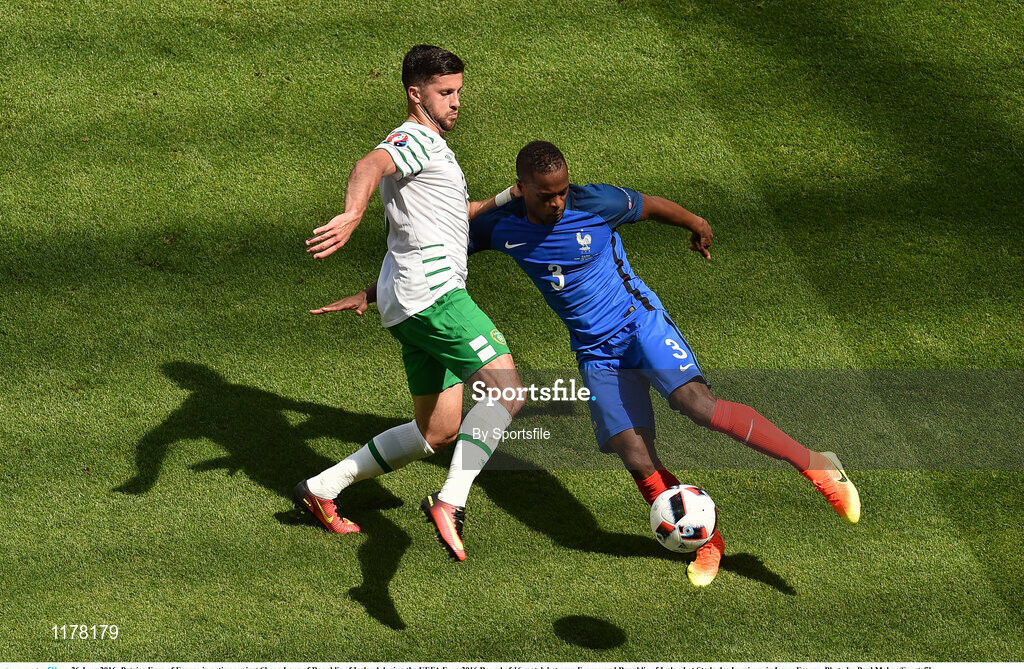 26 June 2016; Patrice Evra of France in action against Shane Long of Republic of Ireland during the UEFA Euro 2016 Round of 16 match between France and Republic of Ireland at Stade des Lumieres in Lyon, France. Photo by Sportsfile