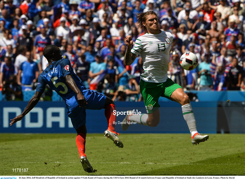 26 June 2016; Jeff Hendrick of Republic of Ireland in action against N'Golo Kanté of France during the UEFA Euro 2016 Round of 16 match between France and Republic of Ireland at Stade des Lumieres in Lyon, France. Photo by David Maher/Sportsfile