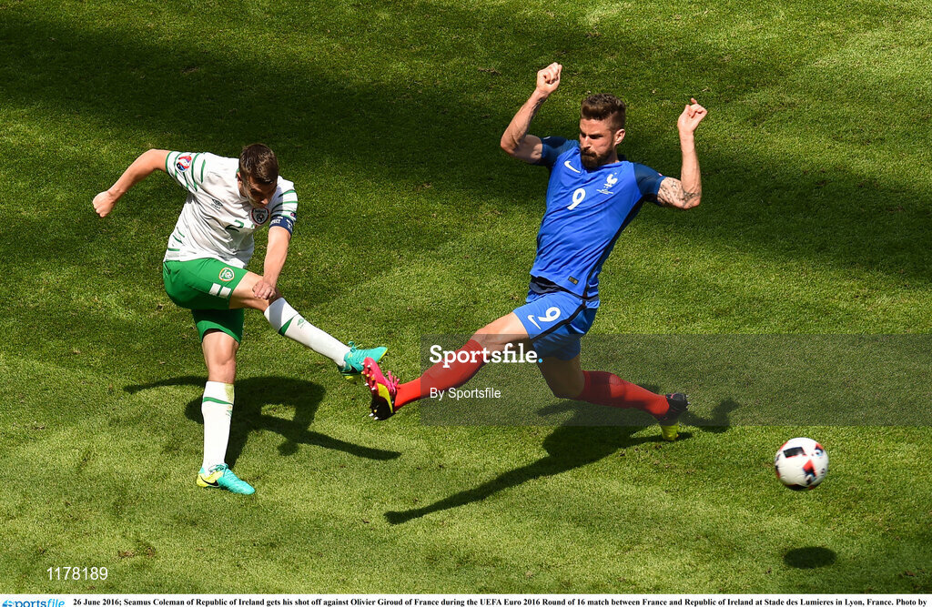 26 June 2016; Seamus Coleman of Republic of Ireland gets his shot off against Olivier Giroud of France during the UEFA Euro 2016 Round of 16 match between France and Republic of Ireland at Stade des Lumieres in Lyon, France. Photo by Sportsfile