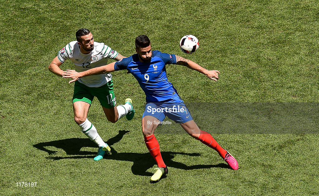 26 June 2016; Olivier Giroud of France is tackled by Shane Duffy of Ireland during the UEFA Euro 2016 Round of 16 match between France and Republic of Ireland at Stade des Lumieres in Lyon, France. Photo by Sportsfile