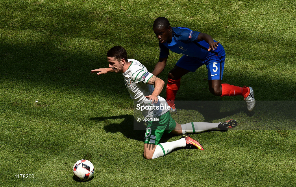 26 June 2016; Robbie Brady of Republic of Ireland is tackled by N'Golo Kanté of France during the UEFA Euro 2016 Round of 16 match between France and Republic of Ireland at Stade des Lumieres in Lyon, France. Photo by Sportsfile