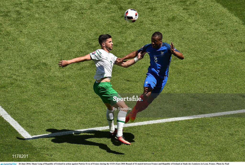 26 June 2016; Shane Long of Republic of Ireland in action against Patrice Evra of France during the UEFA Euro 2016 Round of 16 match between France and Republic of Ireland at Stade des Lumieres in Lyon, France. Photo by Sportsfile