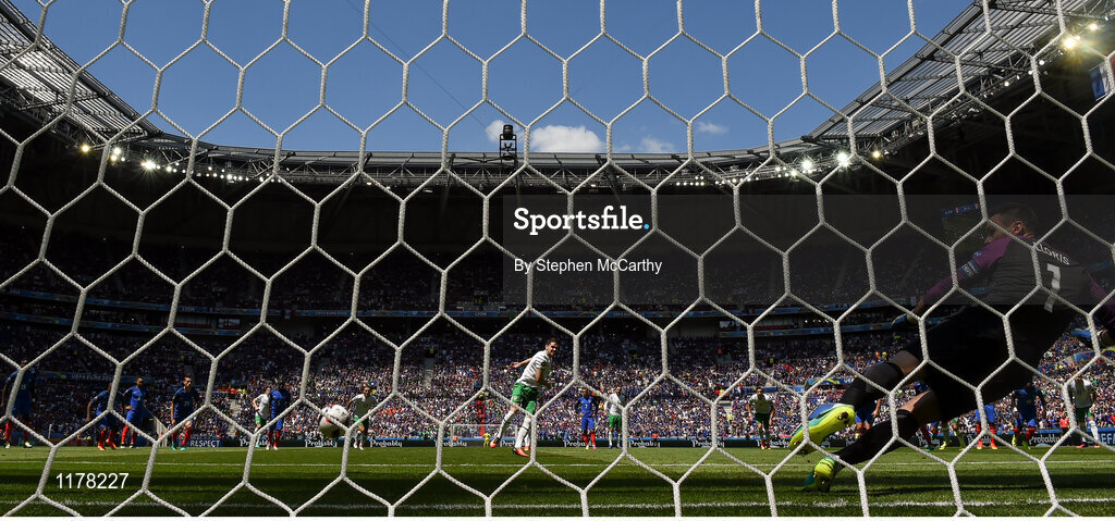 26 June 2016; Robbie Brady of Republic of Ireland scores his side's first goal of the game from the penalty spot during the UEFA Euro 2016 Round of 16 match between France and Republic of Ireland at Stade des Lumieres in Lyon, France. Photo by Stephen McCarthy/Sportsfile