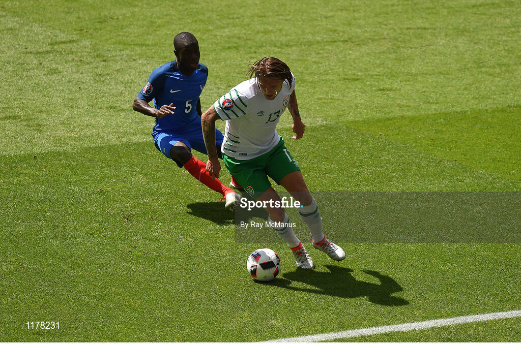26 June 2016; Jeff Hendrick of Republic of Ireland shields the ball from N'Golo Kanté of France during the UEFA Euro 2016 Round of 16 match between France and Republic of Ireland at Stade des Lumieres in Lyon, France. Photo by Ray McManus/Sportsfile