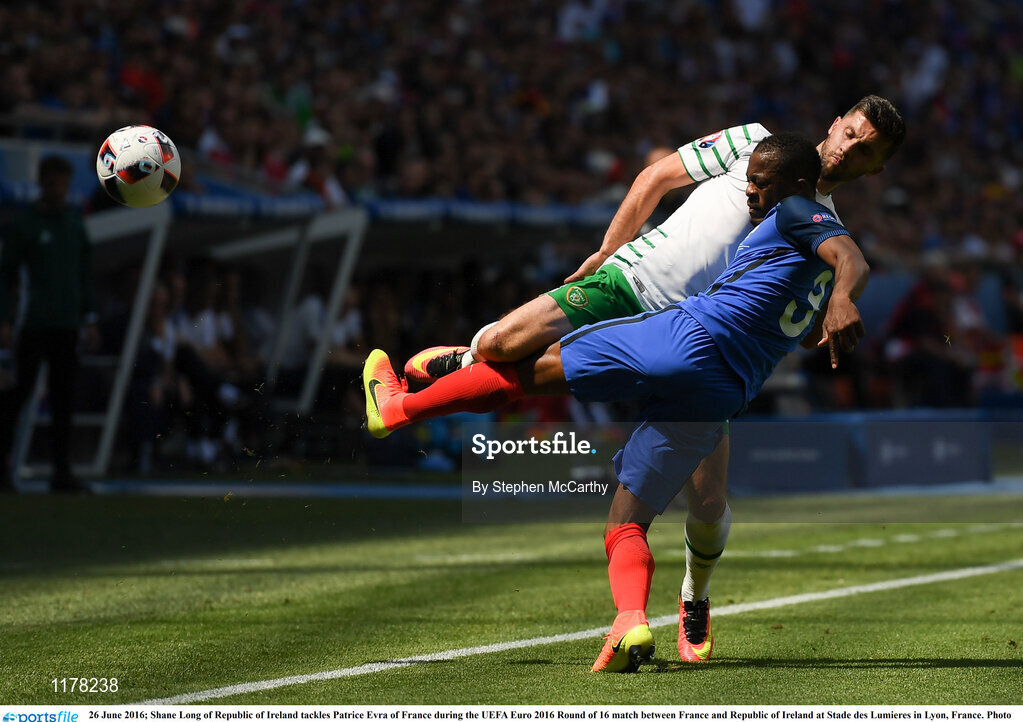 26 June 2016; Shane Long of Republic of Ireland tackles Patrice Evra of France during the UEFA Euro 2016 Round of 16 match between France and Republic of Ireland at Stade des Lumieres in Lyon, France. Photo by Stephen McCarthy/Sportsfile