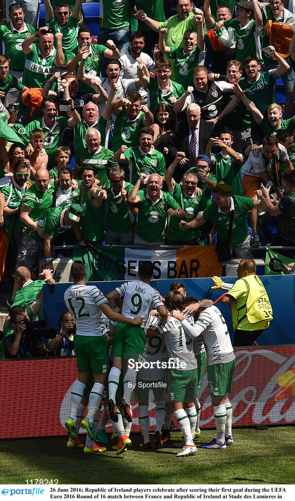 26 June 2016; Republic of Ireland players celebrate after scoring their first goal during the UEFA Euro 2016 Round of 16 match between France and Republic of Ireland at Stade des Lumieres in Lyon, France. Photo by Sportsfile