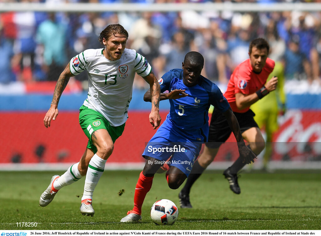 26 June 2016; Jeff Hendrick of Republic of Ireland in action against N'Golo Kanté of France during the UEFA Euro 2016 Round of 16 match between France and Republic of Ireland at Stade des Lumieres in Lyon, France. Photo by Stephen McCarthy/Sportsfile