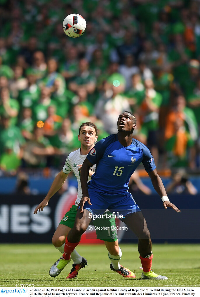 26 June 2016; Paul Pogba of France in action against Robbie Brady of Republic of Ireland during the UEFA Euro 2016 Round of 16 match between France and Republic of Ireland at Stade des Lumieres in Lyon, France. Photo by Stephen McCarthy/Sportsfile