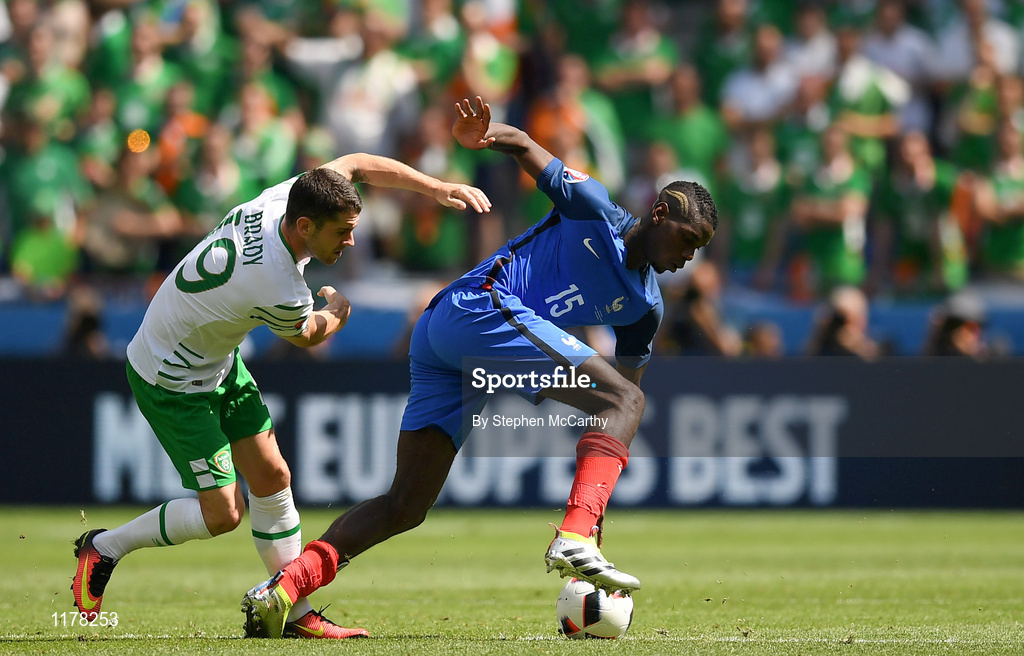 26 June 2016; Robbie Brady of Republic of Ireland in action against Paul Pogba of France during the UEFA Euro 2016 Round of 16 match between France and Republic of Ireland at Stade des Lumieres in Lyon, France. Photo by Stephen McCarthy/Sportsfile