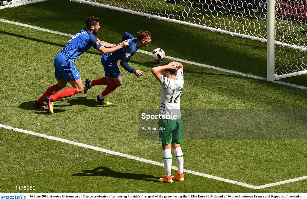 26 June 2016; Antoine Griezmann of France celebrates after scoring his side's first goal of the game during the UEFA Euro 2016 Round of 16 match between France and Republic of Ireland at Stade des Lumieres in Lyon, France. Photo by Sportsfile