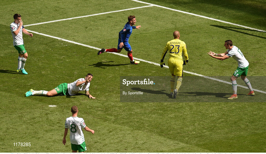 26 June 2016; Antoine Griezmann of France celebrates after scoring his side's second goal of the game during the UEFA Euro 2016 Round of 16 match between France and Republic of Ireland at Stade des Lumieres in Lyon, France. Photo by Sportsfile