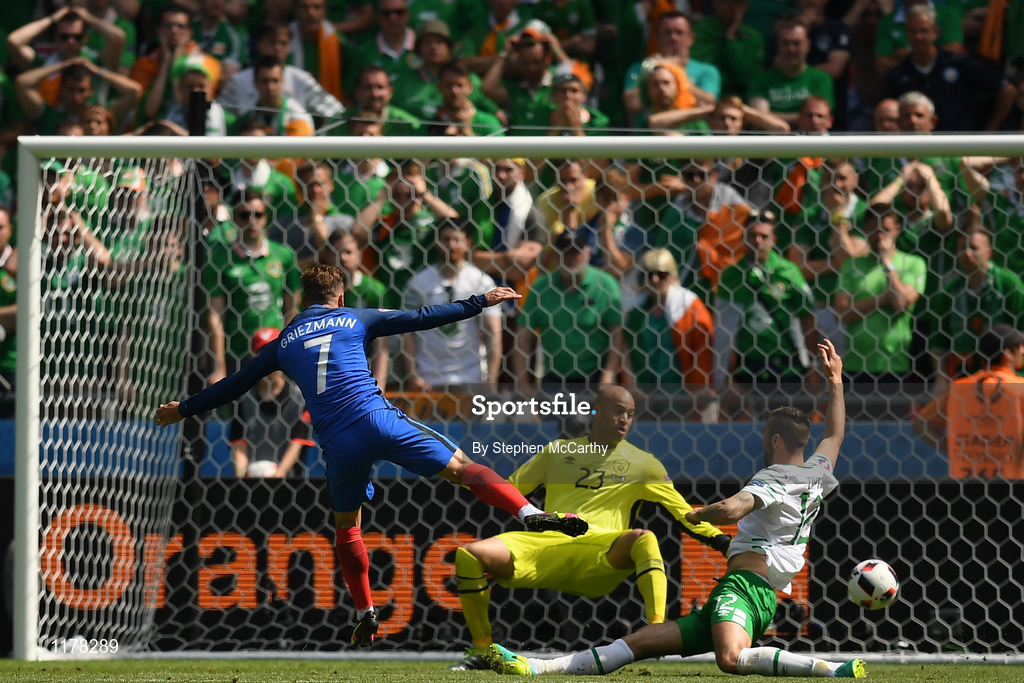26 June 2016; Antoine Griezmann of France shoots to score his side's second goal of the game in the UEFA Euro 2016 Round of 16 match between France and Republic of Ireland at Stade des Lumieres in Lyon, France. Photo by Stephen McCarthy/Sportsfile