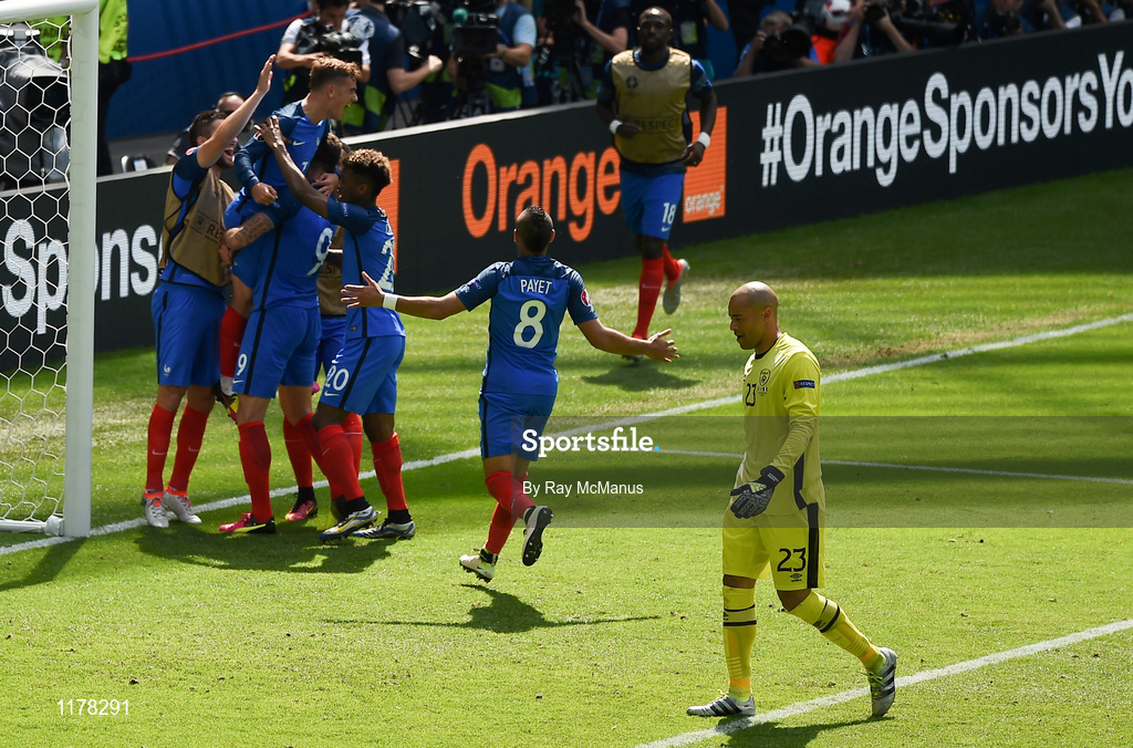 26 June 2016; Antoine Griezmann of France celebrates with team mates after scoring his sides second goal of the game during the UEFA Euro 2016 Round of 16 match between France and Republic of Ireland at Stade des Lumieres in Lyon, France. Photo by Ray McManus/Sportsfile
